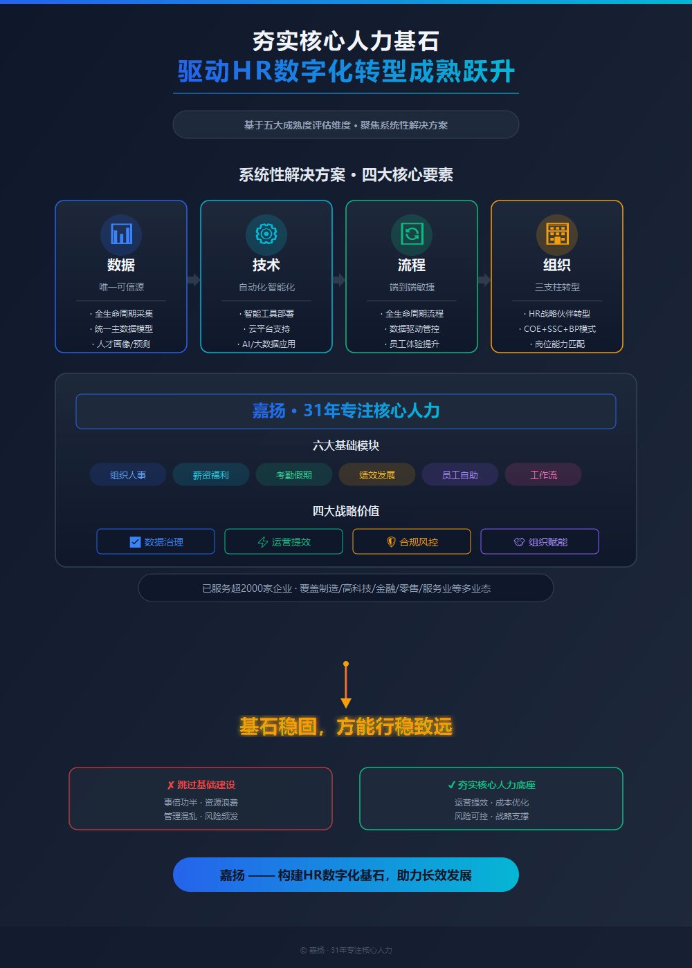 在人力资源管理数字化转型的浪潮中,企业往往热衷于追逐AI招聘、人才分析、员工体验平台等前沿应用,却普遍陷入数据同源性不足、流程协同断裂、管理合规薄弱、投入产出失衡的困境。究其本质,在于忽视了数字化建设的底层逻辑:核心基础不稳固,上层应用皆为空中楼阁。